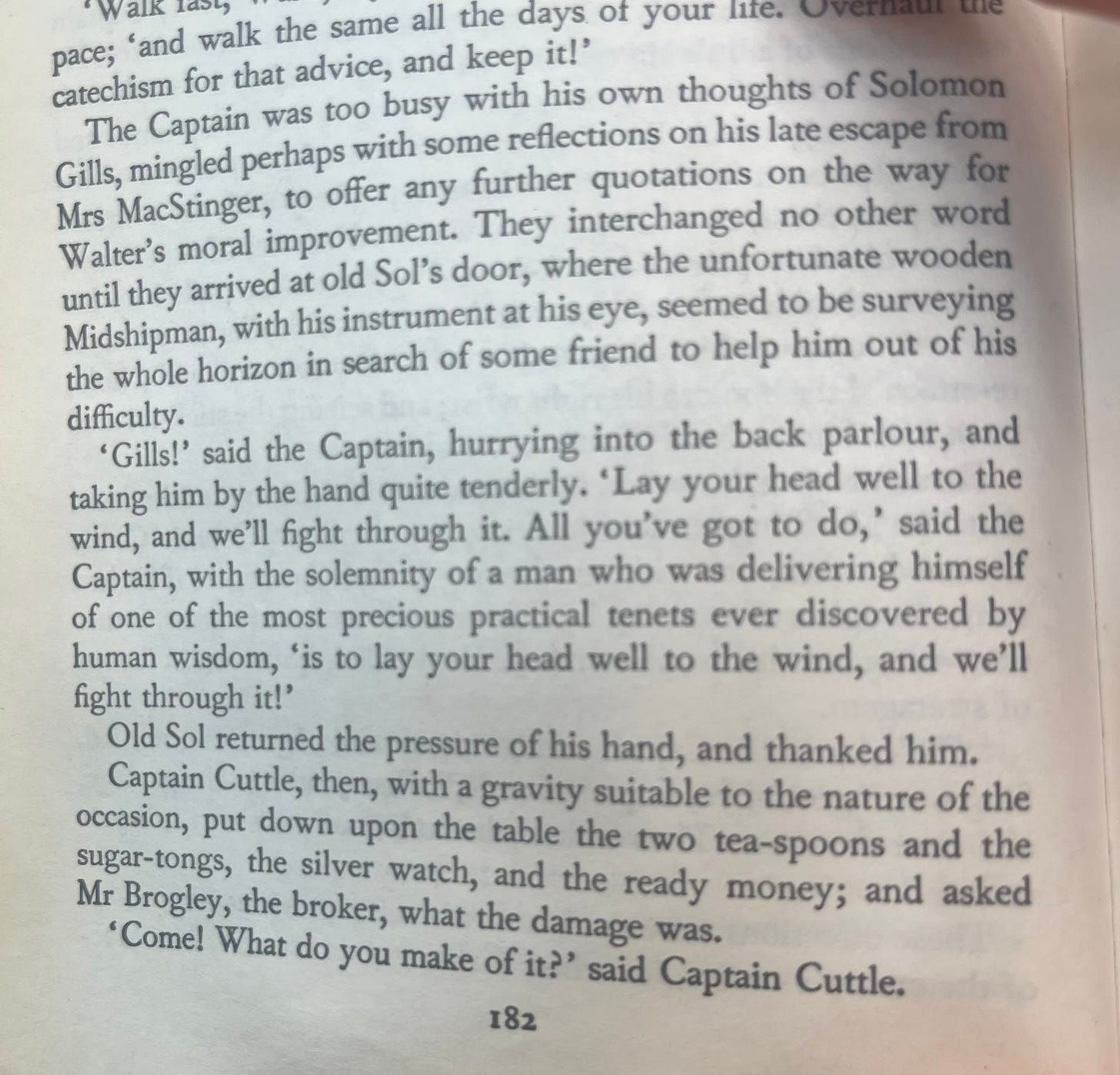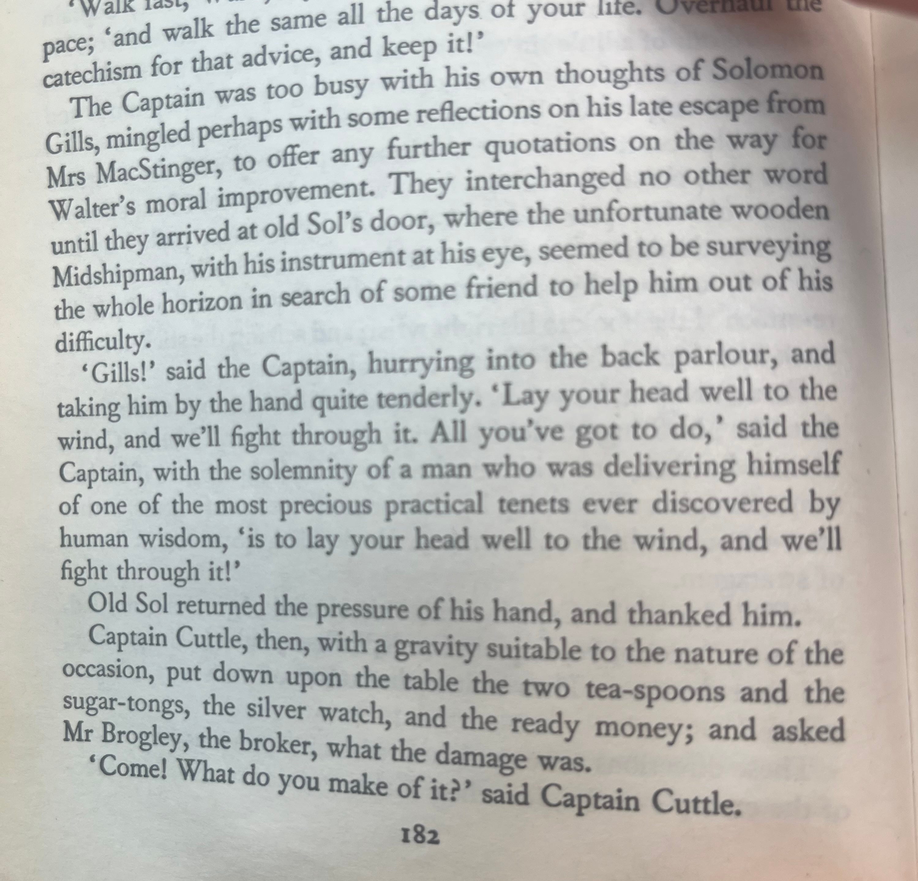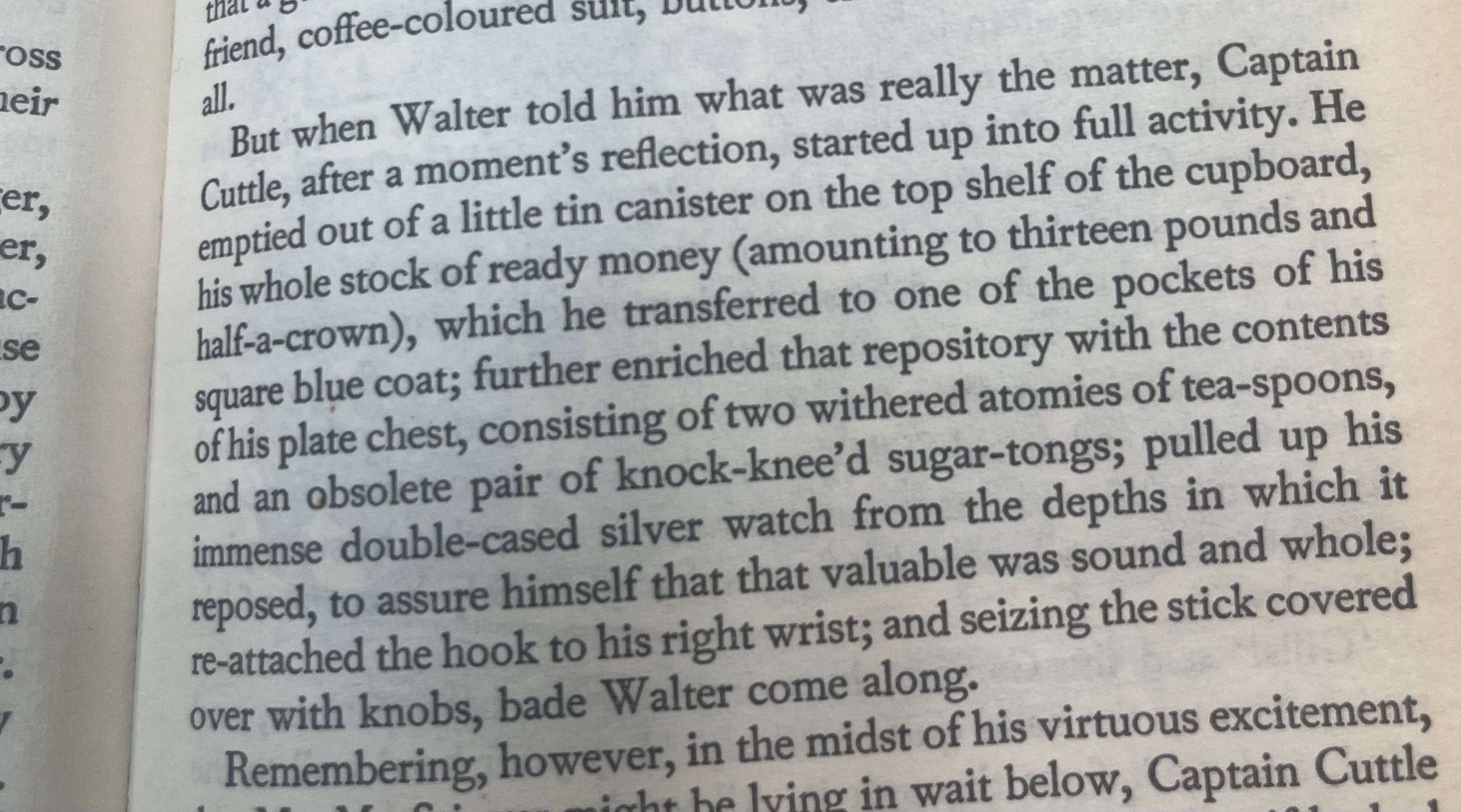 We live in a very sentimental era, so you would think Dickens would be fashionable again, but I think who and what he often sentimentalises we find distasteful ( beyond the children, it is little old drunk men with big hearts, the unglamorous poor, those with unfair debt). Here is Captain Cuttle in Dombey and Son gathering his spare change and sugar-tongs to try and pay off his friend’s enormous debt.