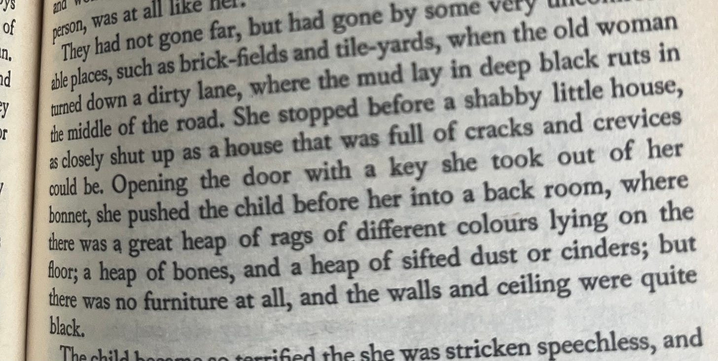 I went to the Dickens museum in London a few weeks ago, right after my train got in from Edinburgh. Its always a shock, grey stones, wind, bitter rain when you get on the train at Waverley, a balmy Ballard like air when you arrive at kings cross and one has to strip off their layers of coat and tartan (actually ). Writers museums are for the most part disappointing beyond fetish items ( a boot, a MS, a pen, a razor) . What do you show? In the DH Lawrence birthplace museum in a suburb of Nottingham I contemplated plastic pork pies and lace doilies. The Brontë Parsonage museum is the only one with any sort of aura, and the odd dimensions of its rooms and size feed your perceptions of the Brontë novels, but the museum insists on annoying exhibitions, which when I visited included a homage to Bramwell by Simon Armitage which demonstrated nothing but Armitage’s pitiful refusal to accept any literary lineage from women writers. I was reading John Carey’s book on Dickens Violent Effigies alongside Dombey and Son, and have recently been fascinated that a big book blogger has an almost hysterical dislike of Dickens, so I suppose I was in the mood. A friend had told me Dombey and Son is one of the rare ones where you are on board with the sentiment and that’s true ( its about a man prioritising sons over daughters) but I read Dickens for the style, for parts like this: