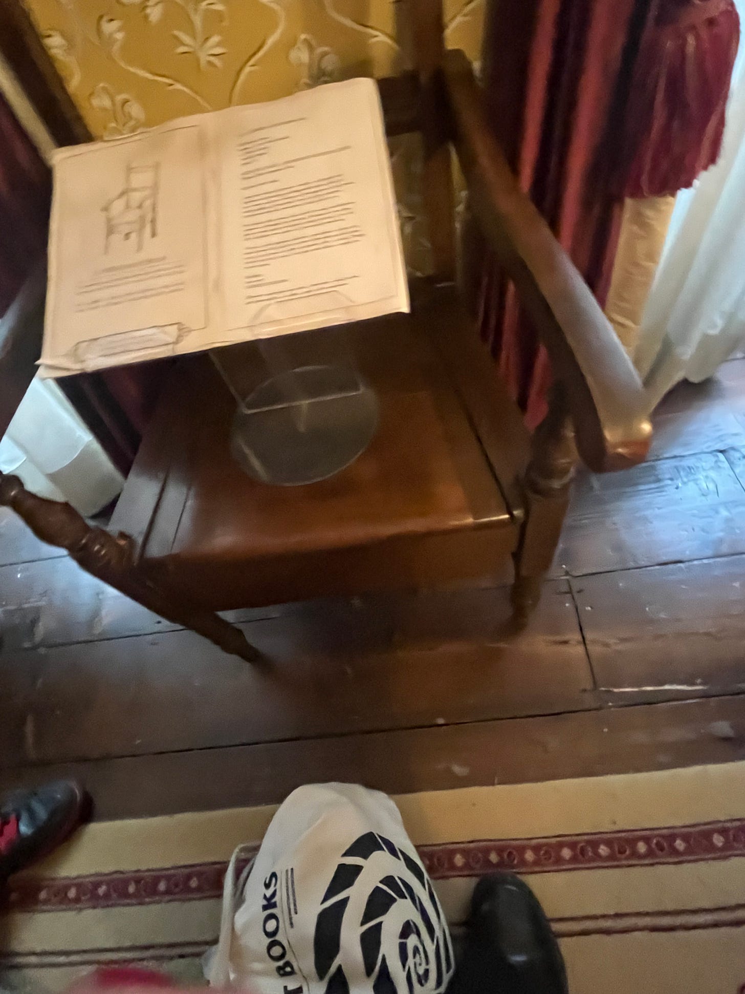 Other parts of the house are a survey of general domestic life in the 19th century. The kitchen informs us that hedgehogs sometimes lived in kitchens to eat all the bugs and I overheard a guide trying to describe porcelain hot water bottles to some other tourists. (The only museum I have been that does this theme well is The Tenement Museum in Glasgow, which still uses gas lamps) I had read that there was a suit or coat of Dickens on display but couldn’t see it anywhere. We were told it had to be removed because the environmental conditions of the house weren’t correct to preserve it. The house had literally been eating it away. Here is the domestic which supported the writer the museum seemed to be telling me. What about his work, his imagination, which upheld and supported this cushy domestic space of sentient pincushions? Dickens worked constantly, wrote himself to exhaustion. I am sick of the elevation of the domestic. It’s a backhanded way of telling me I should go make orange fritters instead of writing books and that child rearing and artistic creation have more in common than crude similes. It's an insult to George Eliot, the Brontë Sisters, Christina Rossetti, Elizabeth Browning. Oyster patties aren’t Middlemarch. The elevation of the domestic is all about interior design, crafts, and flowers and food never about waste, filth, illness, chamberpots, the working class people actually doing the work not just designing the menus. The hidden reality of the domestic is that it is a kind of baleen trying to filth at bay but really having to bask in it. When Vanessa Bell or whomever paints interiors, there is a sanitisation process happening, it’s as unrealistic, as fake as a Victorian painting of a fairy. Thank God I found Dickens’ toilet on display to cut through all the plastic grapes and apples